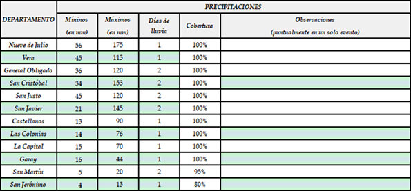 El informe del Sistema de Estimaciones Agrícolas para el Centro Norte de la Provincia de Santa Fe correspondiente al período comprendido entre el 7 y 13 de enero de 2026, que difunde la Bolsa de Comercio de Santa Fe, comienza informando acerca de las lluvias caídas en los departamentos Nueve de Julio, Vera, General Obligado, San Cristóbal, San Justo y San Javier, con montos acumulados superiores a los 110 mm.